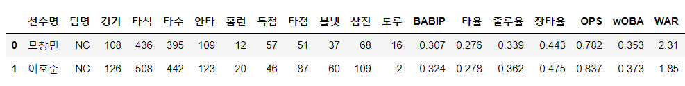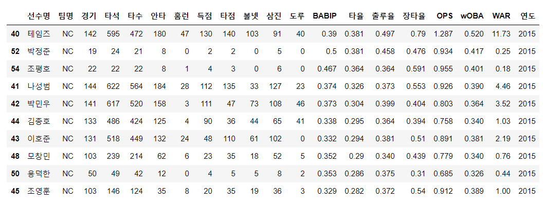 지금까지 설명한 pandas 의 개념을 활용하여 NC 다이노스 선수 데이터를 활용하여 분석해보겠다. 사실 분석이라 하기엔 그렇고 간단히 살펴보겠다.
