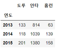 t=df1.pivot_table(index='연도',values=['안타','홈런','도루'],aggfunc='sum')