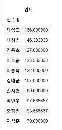 인덱스를 선수명과 안타로 설정한 데이터 프레임을 하나 만들어준다.
