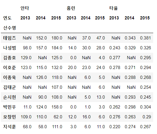 df.set_index(['연도','선수명'])[['안타','홈런','타율']].unstack(0).loc[name]