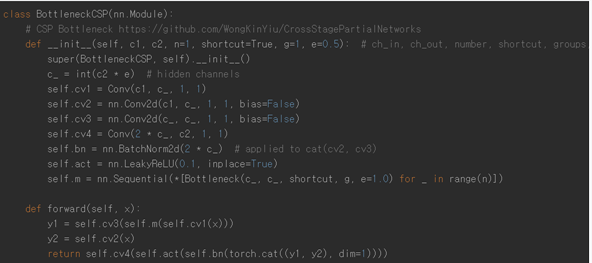 그리고 CSP 구조 답게 y 값을 2개 생성한다. y1은 conv1에서 conv3로 갈때의 연산값이 나오고 y2는 conv2의 값을 받는다. 그리고 이를 conv4에 합치고 이를 반환한다.