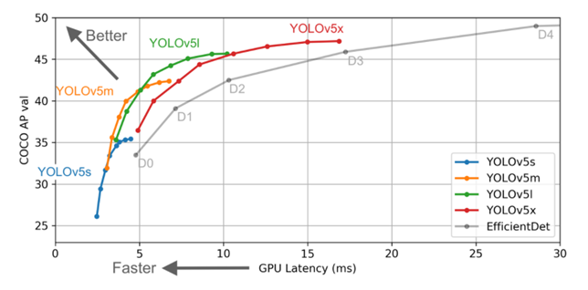 아무튼 YOLOv5의 성능은 다음 그림과 같다