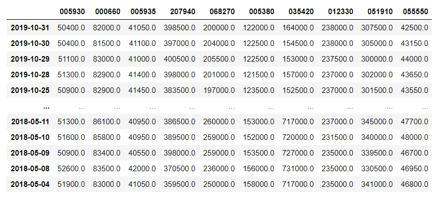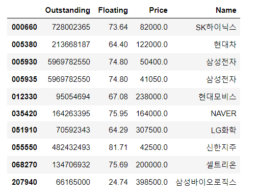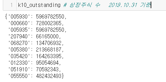 바로 전 게시물에는 KOSPI 200을 추출하였다. 이번에는 상위 10개 종목인 K10을 추출해보겠다. 2019.10.31일 기준 시가총액 상위 10개 기업은 아래와 같다.
