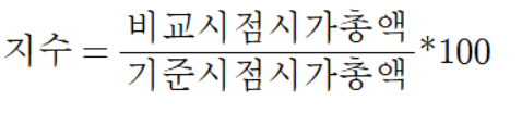 종가들을 다음과 같은 공식을 통해 지수화 시키는 이유는 비교 대상들의 주가를 같은 기준으로 통일하여 비교해야하기 때문이다. 보통 하는 정규화라고 생각하면 된다.