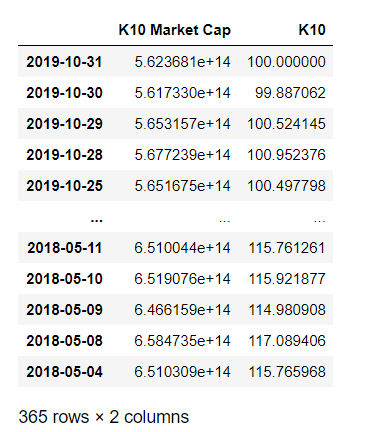K10 Market Cap = K10 종가의 합을 나타내고 K10 컬럼은 K10 종가의 지수를 구한 것이다.