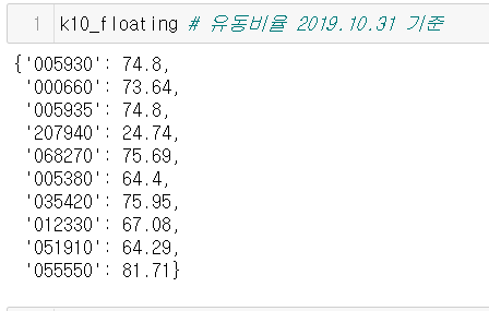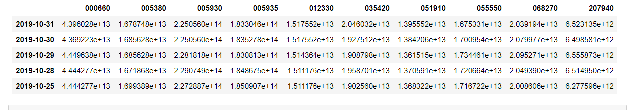 일단 2019.10.31 에 상위 10개 기업의 시가총액, 유동비율, 종가를 데이터 프레임 형식으로 만들어보겠다.