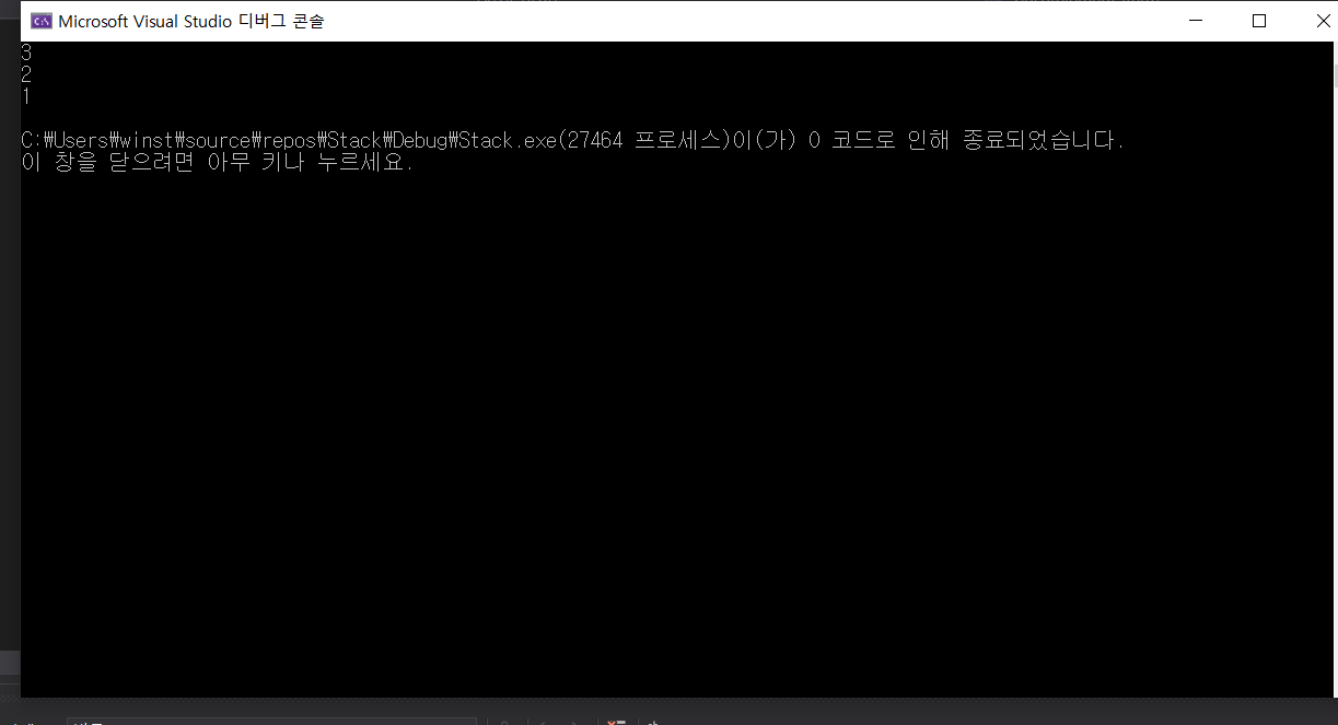위와 같은 결과가 나온다. 먼저 들어간(push)숫자가 가장 밑에 있음을 보여준다.
