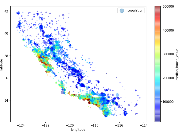 어느 지역에 인구가 많이 모여있는지를 보기 위해 원의 색으로 집의 중앙값을 나타내고 원의 크기로 인구 수를 나타내는 scatter plot을 그림