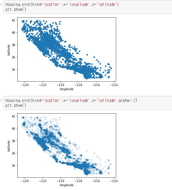 alpha 라는 파라미터로 투명도를 0.2로 조절하여 밀집된 지역을 쉽게 알아볼 수 있게 조절
