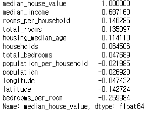 bedrooms_per_room 변수는 집 가격과 음의 상관관계를 갖고 있다는 것을 알 수 있다. 새로운 파생변수 생성