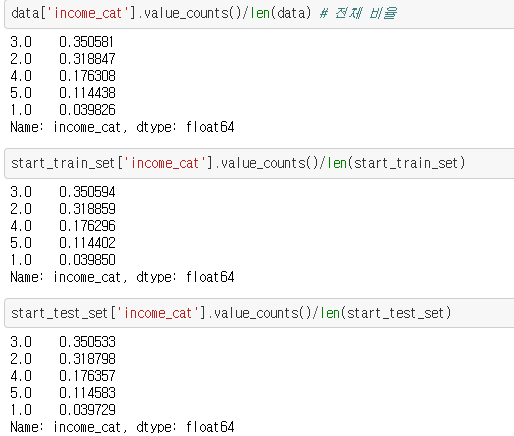 income_cat이라는 변수의 비율 분포에 맞게 계층 샘플링 진행