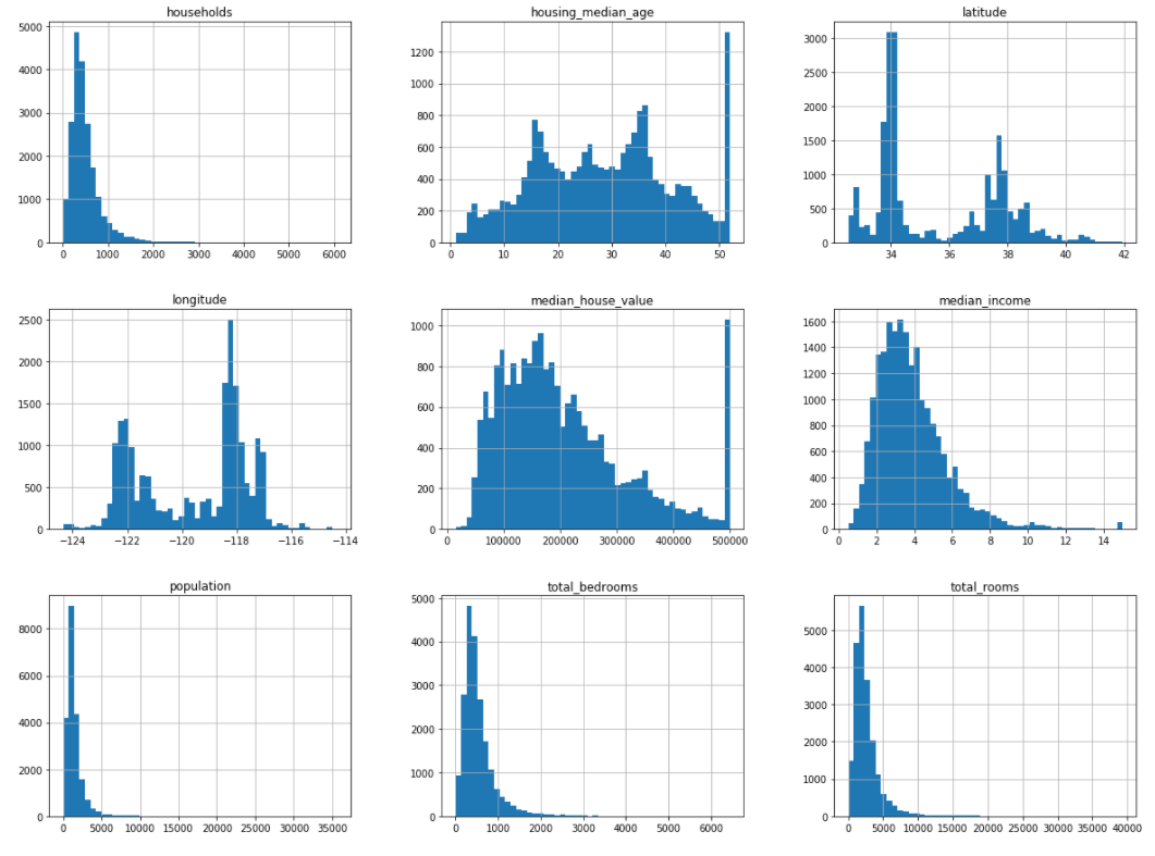 housing median age와 median house value 는 최댓값과 최솟값을 한정함.