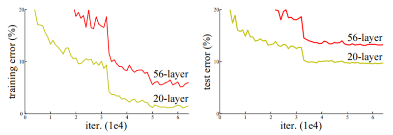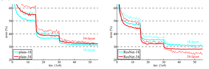 Plain network을 보면 층이 깊어지면(34층) 에러율이 층이 깊지 않은(18층)보다 더 높아진다.