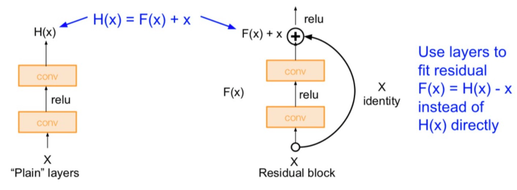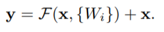 위 식에서 F(x)는 잔차, H(x)는 기존의 network , x는 input 값이다.