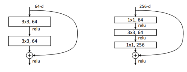 우측 그림은 Building Block으로 layer가 34층인 모델에 사용하고 좌측 그림은 BottleNeck Block으로 50층, 101층 152층에 사용한다.