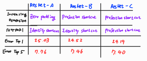 - ResNet-A는 차원을 증가시킬 때 zero-padding을 사용하고 기본적으로 Identity shortcut이 들어간 네트워크다.