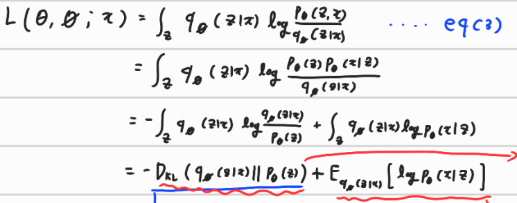 첫 줄에 적분 값은 1로 좌변에 1을 곱해준 것과 같다. 그리고 이를 조건부 확률로 변환한다. 그리고 chain rule을 이용하고 log이므로 전개가 가능하므로 +를 해준다. 4번째 줄에 존재하는 빨간색 줄을 L이라고 하고(좌변과 동일) , + 이후에 있는 식을 KLD에 의해 나타내진다.