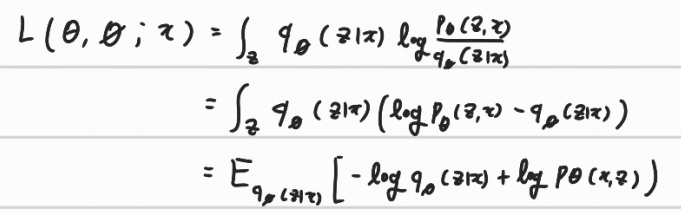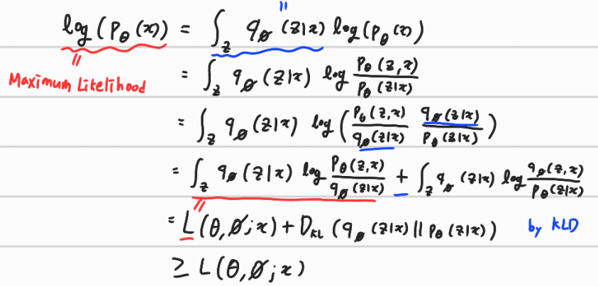 이 떄 L로 표시된 부분을 Lower bound 또는 ELBO라고 부른다. 좌변의 maximum likelihood는 항상 음수의 값을 가지고 )p(x)가 0~1), KLD는 항상 양수의 값을 가진다. 따라서 ELBO는 음수의 값이 된다.