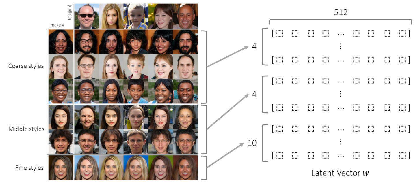 이해를 돕기 위해 나동빈님의 자료에서 발췌해왔다. 앞서 설명한 mixing regularization을 직관적으로 보여주는 그림이라고 할 수 있다. 이미지 A를 기반으로 이미지 B의 특징들을 섞는 것이다. 이 때 이러한 특징을 섞을 때 예를 들면 Coarse style을 적용한다고 하자. 그러면 오른쪽 matrix의 4열 까지는 Image B의 특징을 갖고(image B의 latent vector) 그리고 나머지 열은 Image A의 특징(image A의 latent vector)이 적용되는 것이다.
