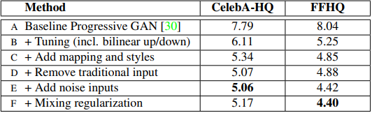 본 논문은 PGGAN을 베이스라인으로 잡고 조금씩 방식을 추가하여 성능을 향상시킨 것을 볼 수 있다. 여기서 F는 논문에서 제안한 모든 기법들을 합친 것이라고 볼 수 있다.(F = A+B+C+D+E + Mixing regularization)