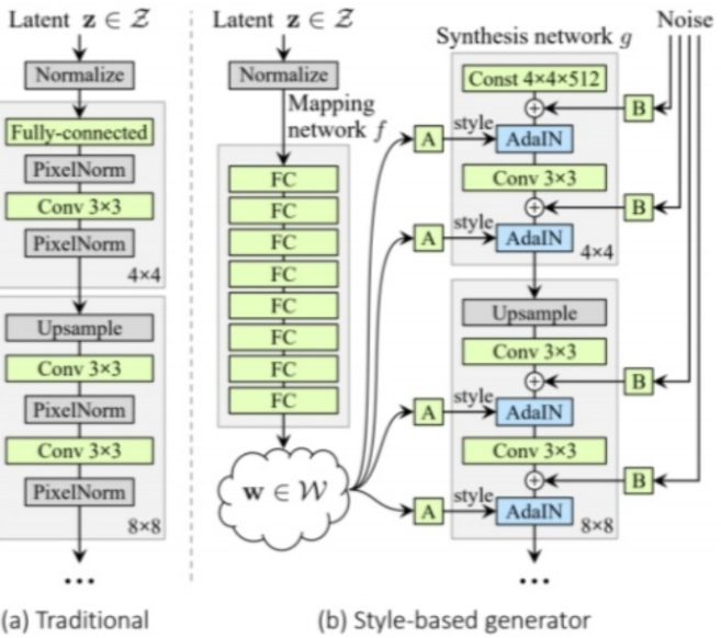 Mapping network는 8개의 layer로 구성되어 하나의 512 latent vector z를 또 다른 하나의 512 shape의 latent vector w를 생성시키는 역할을 한다.