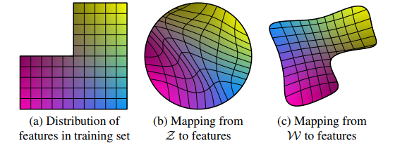 그림에 대한 설명을 조금 더 첨부하자면 a는 학습 데이터셋이다. 여기서 예를 들어 세로 축은 성별(높은 곳은 남성, 낮은 곳은 여성) 이라고 하고, 가로축은 머리 길이(왼쪽은 머리 긺, 오른쪽은 짧음) 이라고 하자. 여기서 데이터셋은 머리길이가 긴 남성이 없다. b 는 기존의 전통적인 방식인 gaussian distribution에서 sampling 한 latent vector z이다. 이 그림에서 보면 보라색과 노란색을 interpolation할 때 가운데 점인 파란색(a에서 오른쪽 아래 색)으로 되게 되는데 이는 entangle하게 될 수 밖에 없다. 즉, 각 특징을 잃어버리게 된다. 그러나 본 논문에서 제안하는 방식 latent vector z를 fully connected 네트워크를 거쳐 매핑한 w space를 보면 그림 c 처럼 각 색이 잘 분리되어 있는 것을 볼 수 있다. 즉, 각각의 특징을 잘 보존할 수 있다는 것이다.
