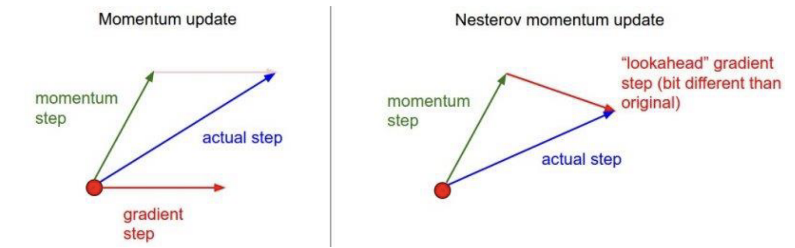 수식에서 momentum과 바뀐점은 loss function의 시작점이다. 즉, \( \theta \) 에서 momentum을 뺀 값의 loss function의 기울기를 구하는 것이다. 따라서 이를 통해 global minima를 통해 더 빠르게 수렴이 가능하다.