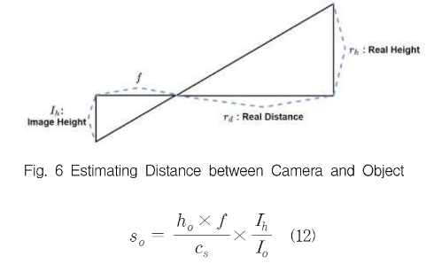 이 전에 2D 이미지만을 이용하므로 객체와 주행체 간의 거리를 판단하여야하는데 이는 다음과 같은 식을 통해 추정하였다.