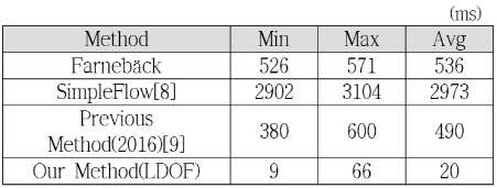 특징점을 기반으로 한 Lucas Kanade 방법이 있지만 shi-tomashi 방법으로 특징점이 추출이 안되거나 일부 특징점으로 Optical Flow를 추정하기 때문에 정확도가 낮아지는 단점이 있다. 따라서 본 논문에선 이를 극복하기 위해 Farneback Gunner 알고리즘을 사용하였다.
