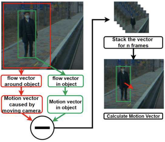 그림에도 설명하였듯이 초록색 부분은 객체의 움직임만 추출하기 위함이고, 주변벡터를 계산하는 것은 주행체의 움직임 즉, Ego Motion을 제외하는 것이다. 이를 통해 주행체의 움직임을 제외한 객체의 순수한 움직임을 추정할 수 있다. 또한, 이렇게 추정한 객체의 움직임을 5번 누적한다. 이는 벡터의 안정화를 위함이다.