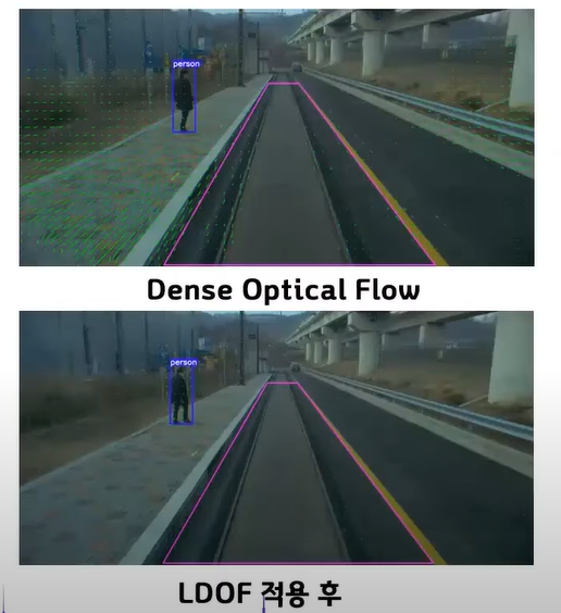 Dense Optical Flow로만 추정하였을 때는 주행체의 움직임만 계산되었지만 LDOF 적용을 하면 객체 주변의 움직임만 추정됨을 볼 수 있다. (사실 대표 벡터를 그릴라 했는데 귀찮아서 안그렸습니다...ㅎㅎ)