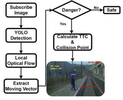 본 논문은 자율주행 트램을 위하여 트램의 특수한 환경에서 보행자의 위험을 예측하여 제어를 할 수 있는 방법을 제시하였다. 객체 탐지는 YOLOv5를 통하여 수행하고 객체를 탐지하는 동시에 LDOF라는 개념을 적용하여 보행자의 움직임을 추정할 수 있다. 또한, TTC(Time-To-Collision)을 계산하여 위험 여부를 판단하는 시스템을 제안하였다. 본 모델의 전체적인 흐름은 다음과 같다.