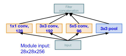 28x28x256 사이즈 input 값에 1x1 filter 128개, 3x3 filter 192개, 5x5 filter 96개, 3x3 maxpooling을 적용한다.