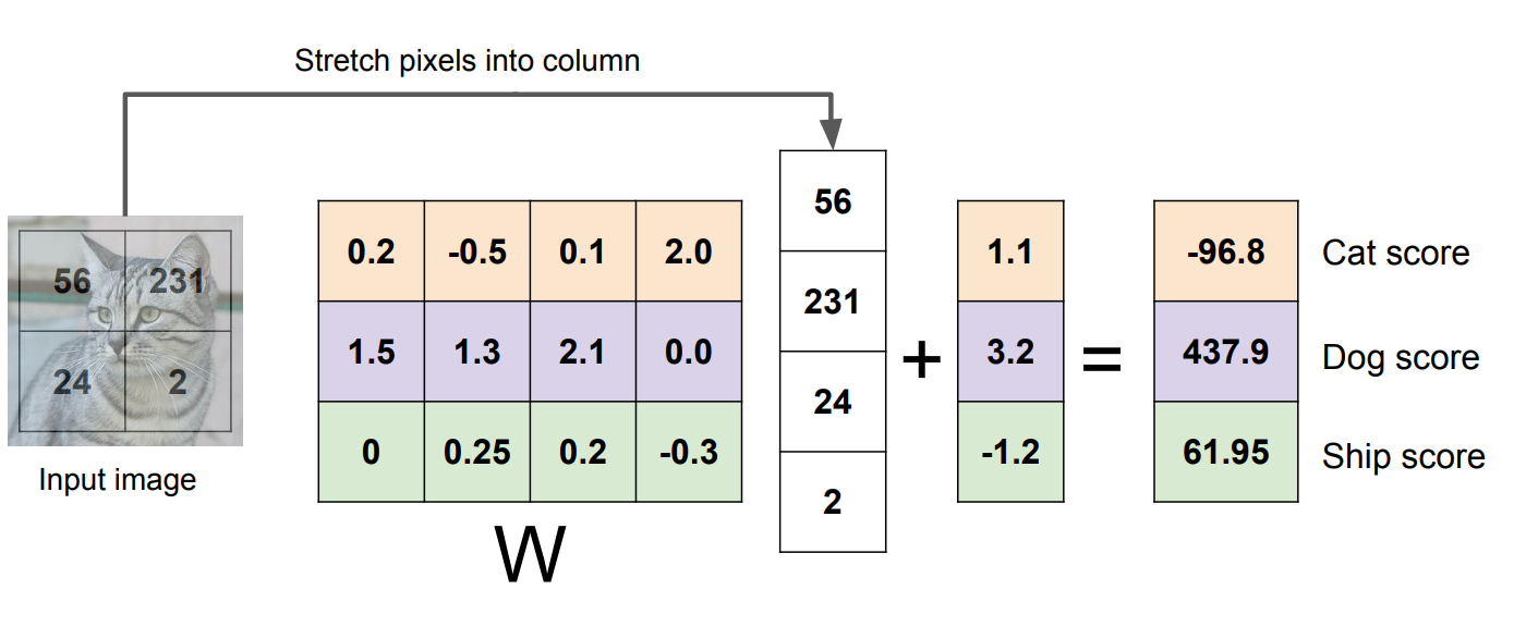 그리고 이를 계산하기 위해 W의 shape은 (10,3072) 가 된다. 여기서 10은 10개의 클래스를 예측하기 위함이다.
