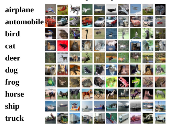 강의에선 예제 데이터셋으로 CIFAR-10을 사용한다. CIFAR-10은 32x32 이미지이고 클래스는 10개이다. 그리고 5만장의 훈련 이미지와 만장의 test 이미지로 구성되어있다.