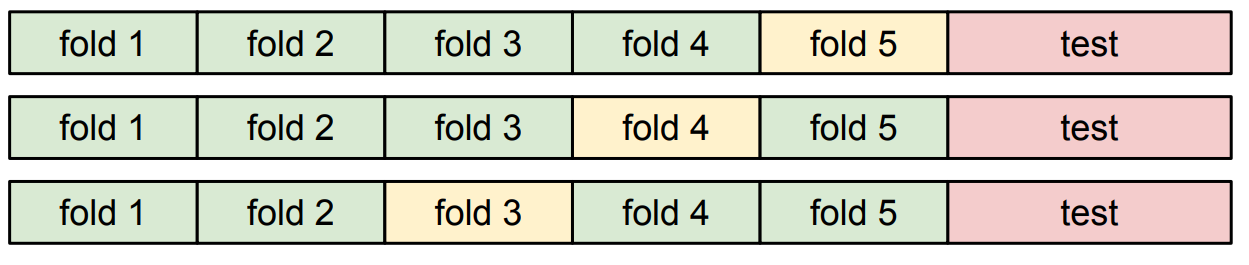 즉, 1 iteration 땐 fold1~4 를 training set으로 fold5를 validation set으로 설정한다.
