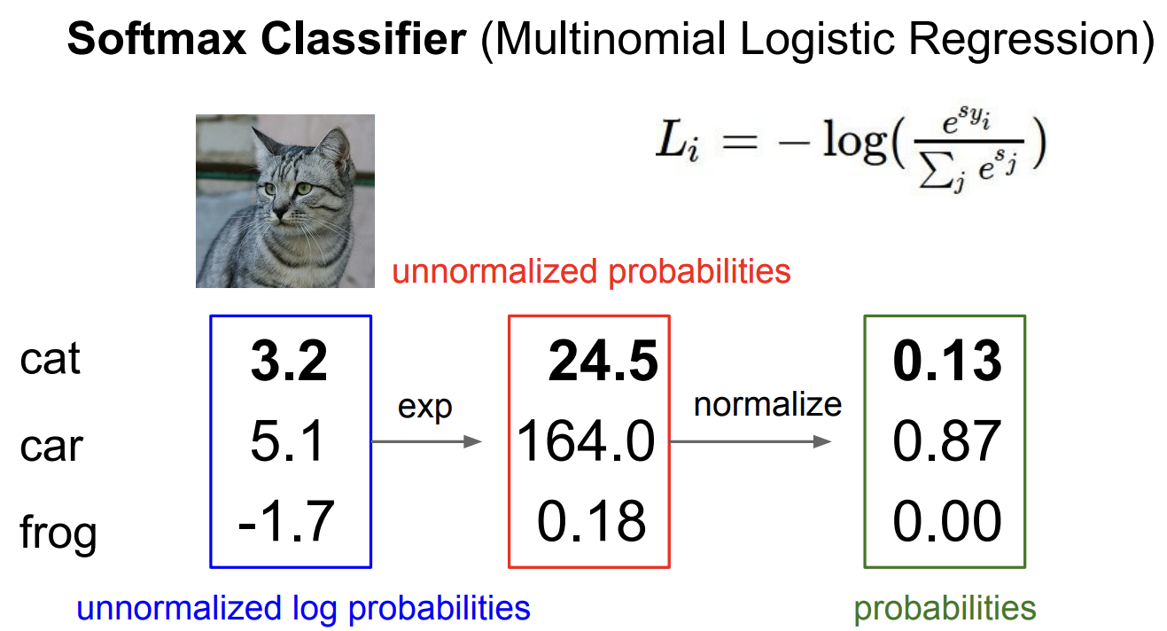 softmax classifier의 score는 class를 log화한 확률이라고 말한다. 이를 수식으로 표현하면 다음과 같다.
