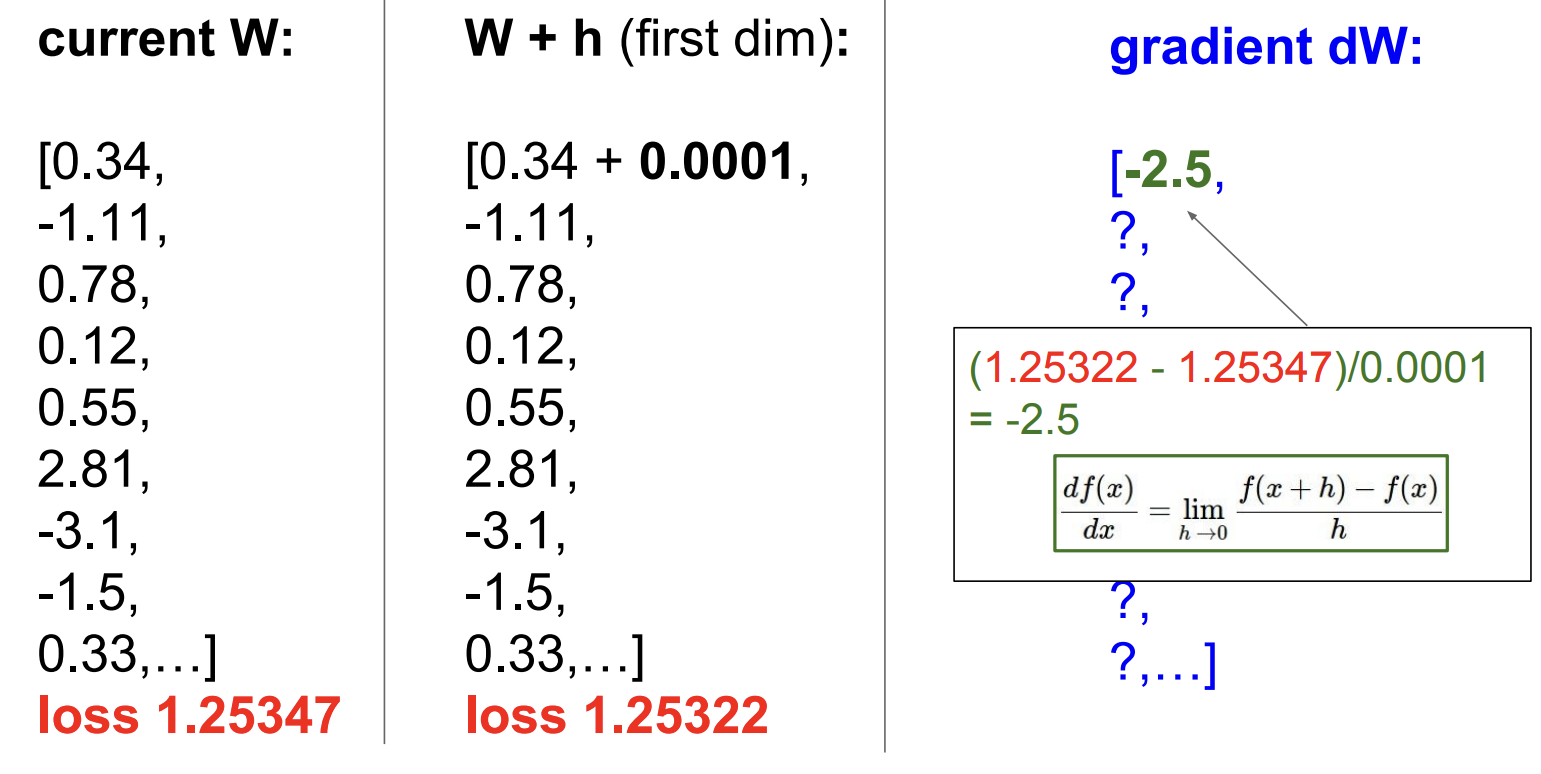 Gradient는 W+h 에서 한 값에 0.0001을 더한 값에 loss의 변화: f(x+h) 원래 loss : f(x) 를 뺀 것을 h로 나눠준 것이다.