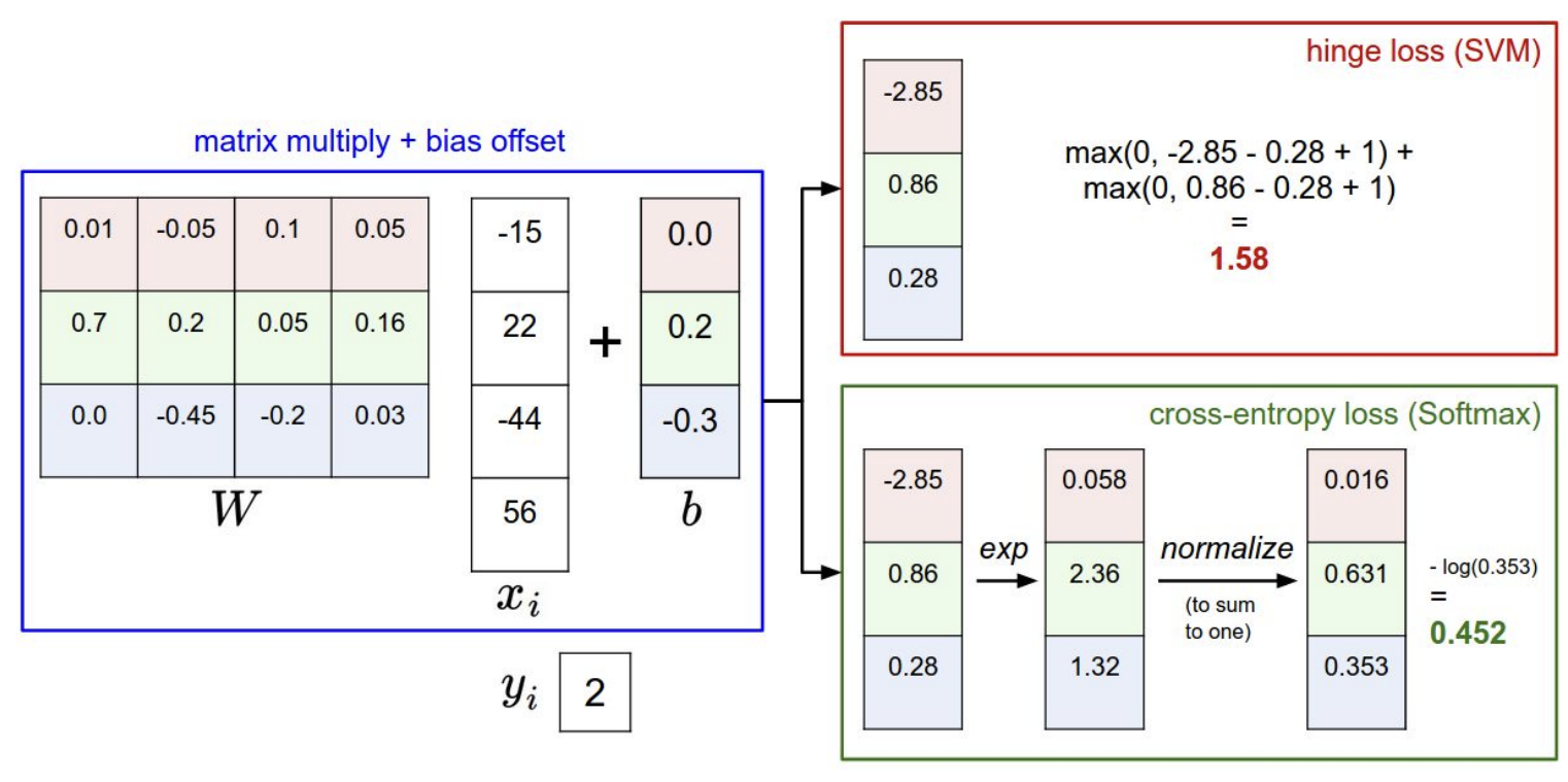 그림에서 보이는 바와 같이 Hinge Loss는 1.58 이라는 loss 가 나오고 Cross Entropy Loss는 0.452라는 값이 나온다.