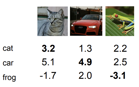 고양이를 예로 들면 cat의 correct score = 3.2이다. 고양이 기준으로 incorrect score는 car = 5.1, frog = -1.7 이 된다.