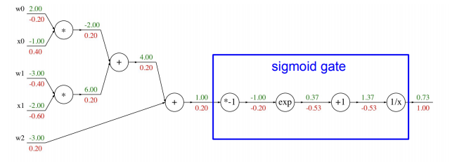 위 그래프는 sigmoid function을 통과하는 \( f(w,x) \)를 그래프로 나타낸 것이다. 따라서 우리가 결국 계산해야할 것은 input에 대한 loss의 영향력을 구하는 것이다.