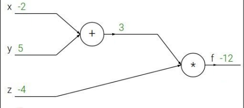 위 그래프는 \( f(x,y,z) = (x+y)z \)를 그림으로 나타낸 것이다. 그리고 x = -2, y=5, z=4를 임의로 대입한다.
