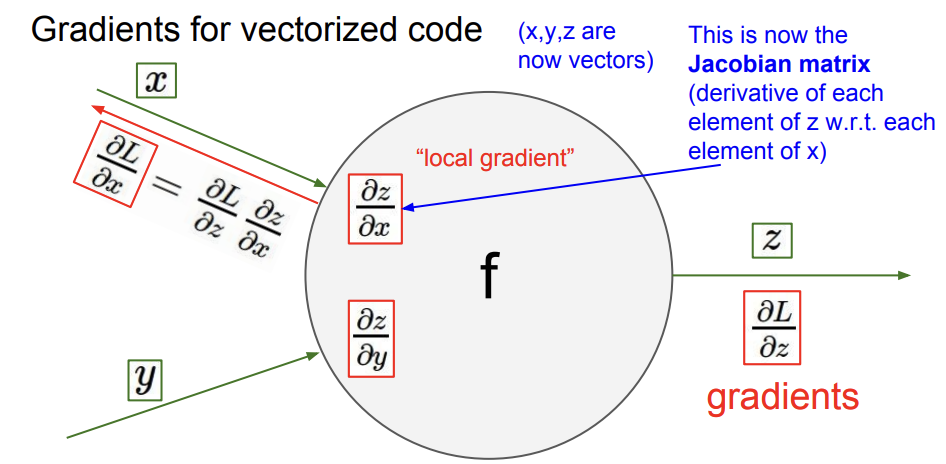 실제 데이터는 matrix 형태로 계산되기 때문에 vector 형태의 계산을 해야한다. 이 때, local gradient는 미분값으로 이뤄진 행렬 jacobian matrix가 된다.