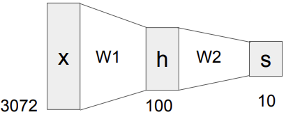 예를 들어 CIFAR10의 데이터셋을 input 값으로 들어간다 하자. 위 그림처럼 w1 이라는 weight 값 matrix를 통과한 후 중간의 h라는 hidden layer를 통과한다. 그리고 여기서 hidden layer를 통과한 값들에 또 w2라는 weight 값을 통과시켜서 s라는 output layer로 나오게 된다. 이는 10개의 클래스를 분류할 수 있게 한다.