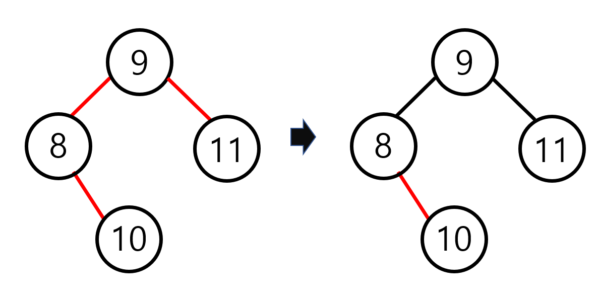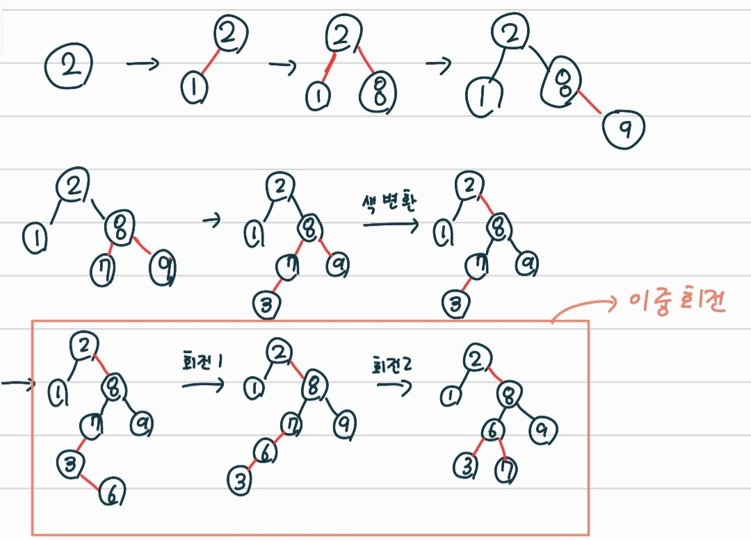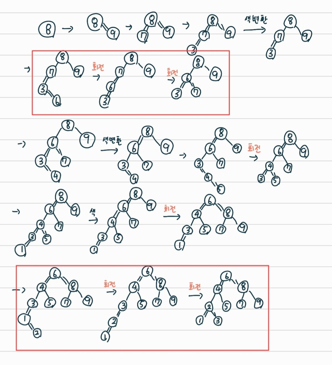처음은 루트노드여서 black이고 나머지는 들어올 때 red 로 들어온다고 생각하면 된다. 그래서 1은 2보다 작으니 왼쪽, 8은 2보다 크니 오른쪽으로 레드-레드가 되고, 그 다음 9가 들어올 땐 우선적으로 양 쪽에 있는 red 색깔을 블랙으로 바꾼다. 여기서 부모노드가 root 노드이니 상위 노드가 없으므로 그대로 블랙으로 변환이되고 9가 삽입된다.