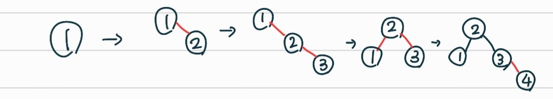 이처럼 숫자가 2가 루트노드로 가서 1,3을 자식노드로 갖게 되고 그 다음에 색깔이 black으로 바뀐 후, 4가 삽입된 것을 볼 수 있다.