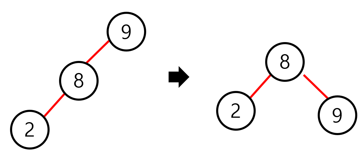이런 경우는 어떻게 처리할까? 이런 경우에는 두번의 회전 과정이 필요하다. 첫번째로는 한줄로 펼쳐주는 과정이 필요하다. 이 때, 맨 밑의 노드가 그 위의 상위 노드보다 크기 때문에 9-2-8 인 순서를 9-8-2의 순서로 바꿔야한다. 그 다음에는 단순 회전과 같은 형태로 풀어나가면 된다.