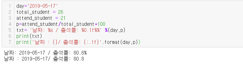 print(txt)는 txt라는 변수에 %s (문자형), %f(실수형) 이라는 기본 포맷팅 구조를 넣어 미리 생성해둔 day와 p를 %s와 %f의 자리에 넣는 것이다.