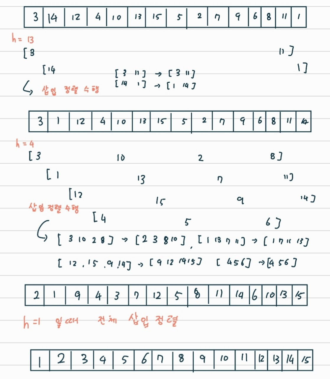 첫번쨰에서 서브리스트를 나누는 h를 계산한담에 서브리스트를 나눈 후 삽입 정렬을 하게 된다.