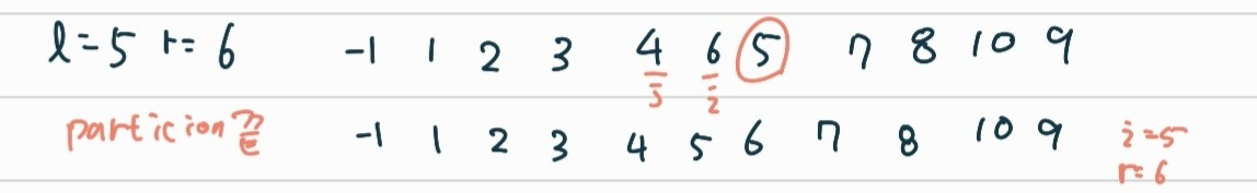 - 왼쪽 파티션에 있는 원소 a[l] , ... a[i-1] 중 피봇보다 큰 원소는 없다. (즉, a[i]는 피봇보다 큰 원소일 수 있다)
